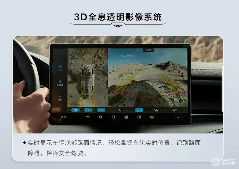 实时显示车辆底部路面情况,轻松掌握车轮实时位置、识别路面障碍,保障安全驾驶。