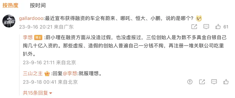 同时,李想在回复网友评论表示:蔚小理在融资方面从没造过假,也没虚报过,三位创始人是为数不多真金白银自己掏几十亿入资的。那些虚报、造假的创始人普遍自己一分钱不掏,再注册一堆关联公司吃里扒外。