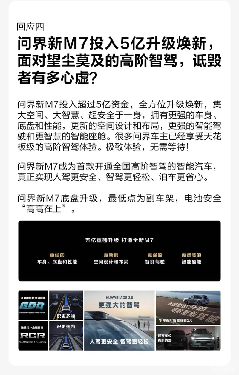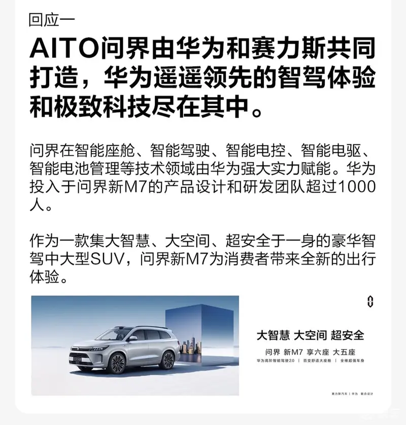 相关质疑涉及赛力斯与华为的关系、油改电以及问界M7中保研测试成绩等一系列问题。对此,问界强调,AITO问界由华为和共同打造,华为投入于问界新M7的产品设计和研发团队超过1000人。其技术涉及智能座舱、智能驾驶、智能电控、智能电驱、智能电池管理等技术领域。
