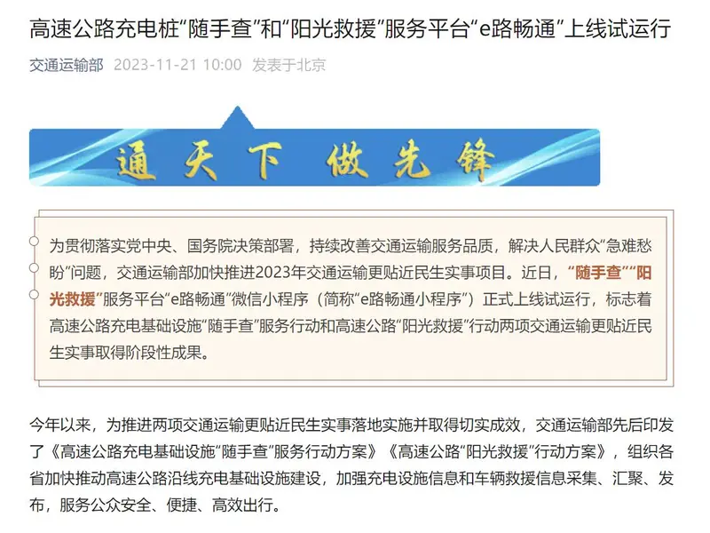 今年以来,为推进两项交通运输更贴近民生实事落地实施并取得切实成效,交通运输部先后印发了《高速公路充电基础设施“随手查”服务行动方案》《高速公路“阳光救援”行动方案》,组织各省加快推动高速公路沿线充电基础设施建设,加强充电设施信息和车辆救援信息采集、汇聚、发布,服务公众安全、便捷、高效出行。