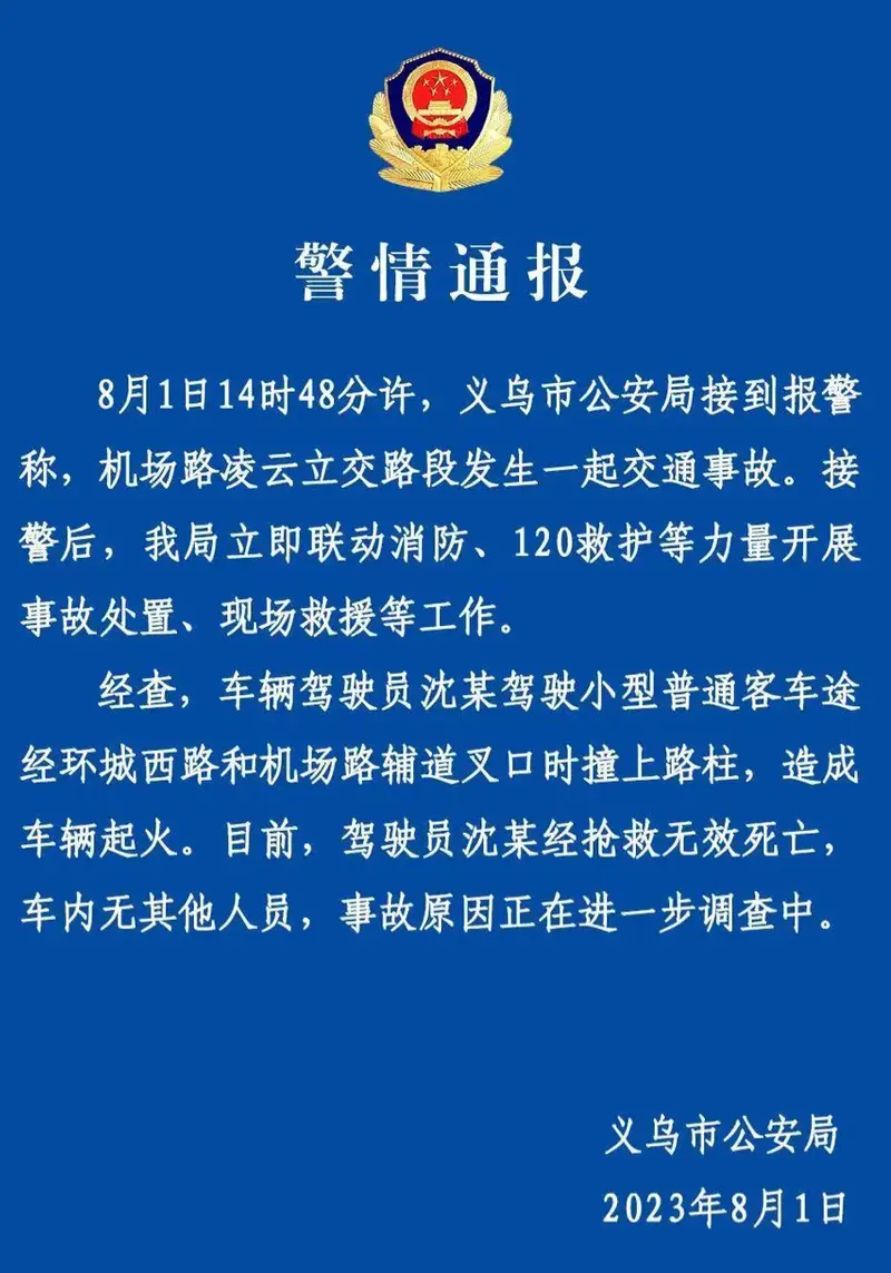 8月1日14时48分许,义乌市公安局接到报警后立即组织消防、120救护等展开了事故处置和现场救援等工作。经调查,车辆驾驶员沈某驾驶小型普通客车途经环城西路和机场路辅道叉口时撞上路柱,造成车辆起火。驾驶员沈某经抢救无效死亡,车内无其他人员。