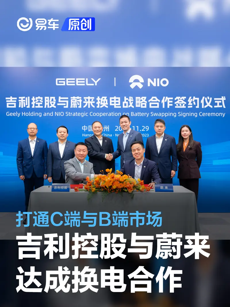 易车讯 11月29日,吉利控股与蔚来在杭州签署换电战略合作协议,双方将在换电电池标准、换电技术、换电服务网络建设及运营、换电车型研发及定制、电池资产管理及运营等多个领域展开全面合作。这也是继长安汽车后,第二家与蔚来在换电业务合作的整车企业。
