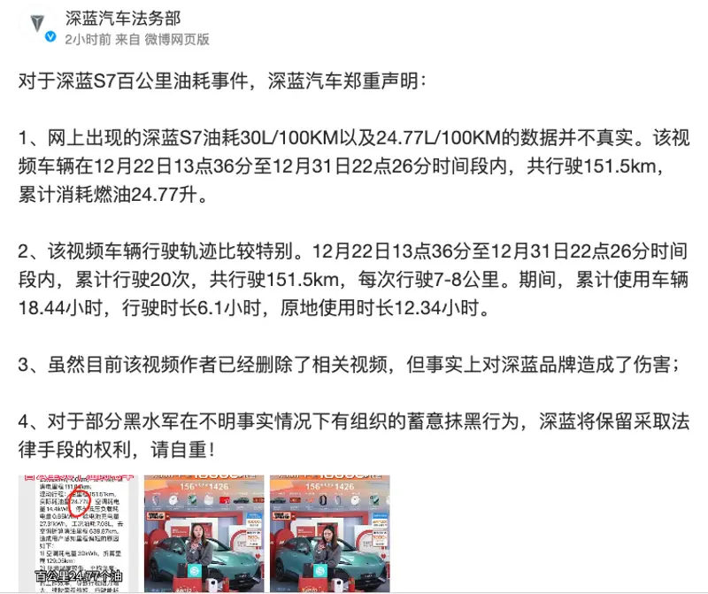 根据深蓝汽车官方表述,网上出现的深蓝S7油耗30L/100KM以及24.77L/100KM的数据并不真实。该视频车辆在12月22日13点36分至12月31日22点26分时间段内,共行驶151.5km,累计消耗燃油24.77升。