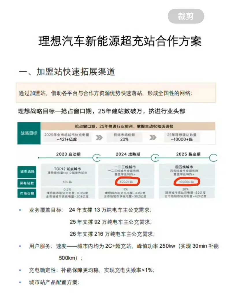 易车讯 日前,我们从网络获得了理想汽车新能源超充站合作方案规划,根据规划显示,理想汽车至2025年将建设超过1万座超充站,目标市场份额20%,四五线城市覆盖率达到90%。