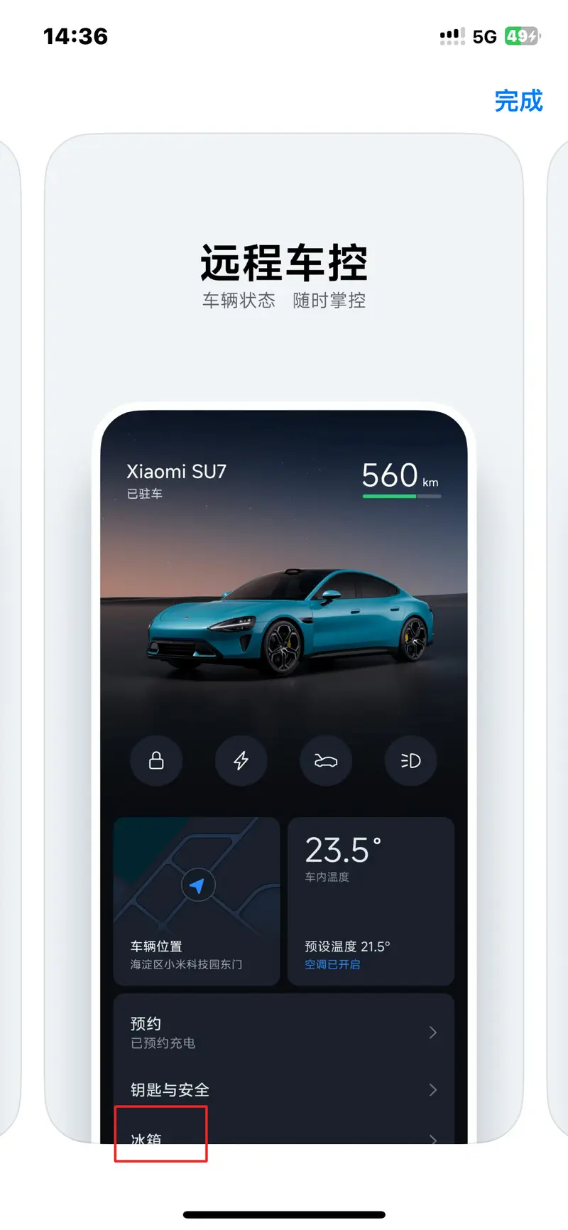 同时,目前透露出的车控页内容显示,小米SU7会搭载车载冰箱。据知情人透露,冰箱位置位于中央扶手箱下面,其开启方式与理想的一样,是在后排推拉。