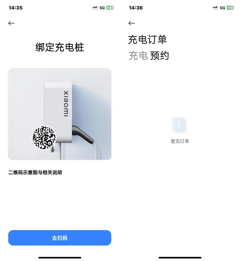 从其APP界面我们可以看到,小米汽车APP提供了绑定充电桩功能,用户只需扫描二维码即可完成绑定,并随时在APP中查看充电订单,但相关页面尚未显示小米充电桩的具体充电功率。