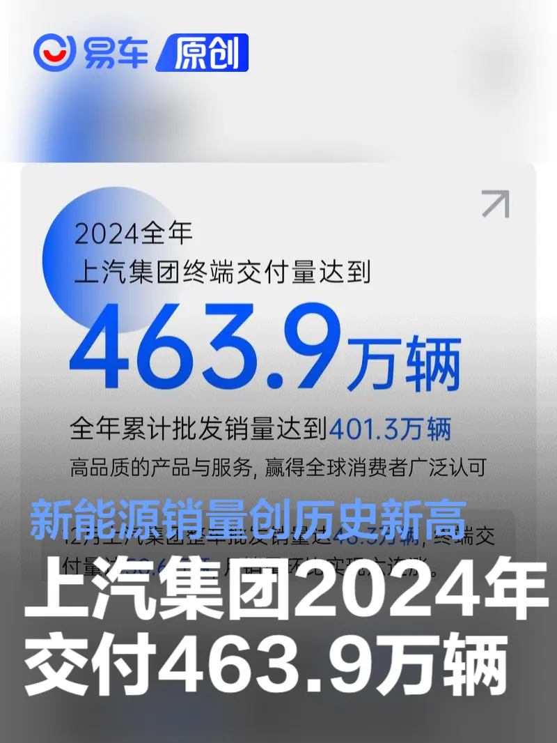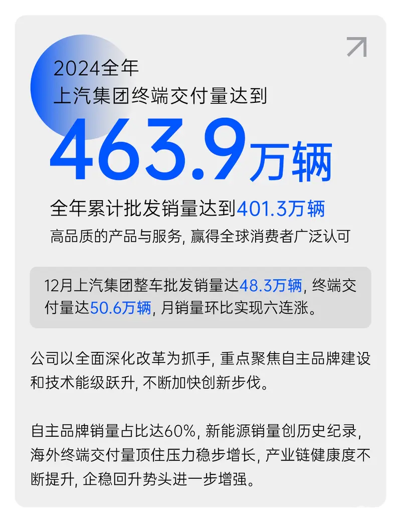易车讯 1月1日,上汽集团宣布,2024年终端交付463.9万辆,累计批发销量401.3万辆。12月整车批发销量48.3万辆,终端交付50.6万辆,月销量环比六连涨。