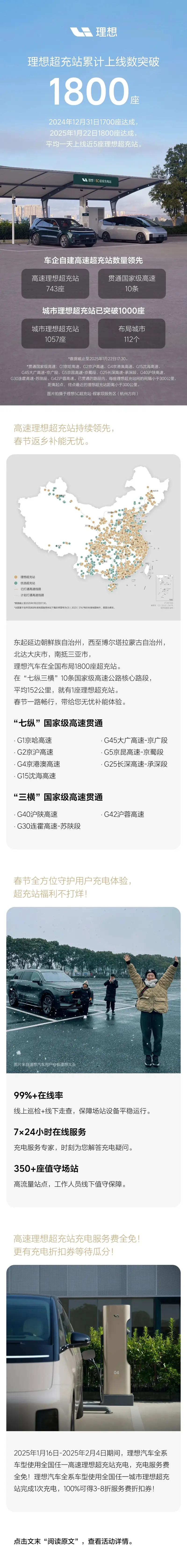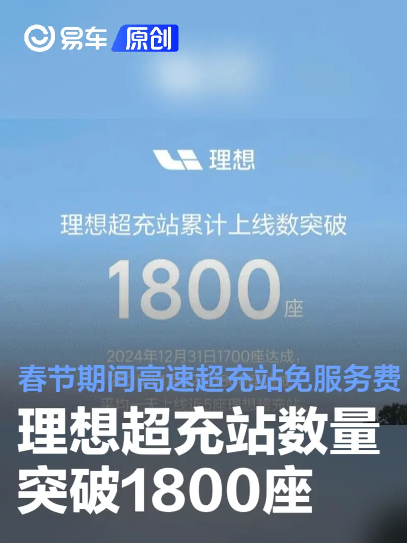 易车讯 1月23日,理想汽车宣布理想超充桩累计上线数突破1800座,平均一天上线近5座理想超充站。其中,高速理想超充站743座,城市理想超充站1059座。