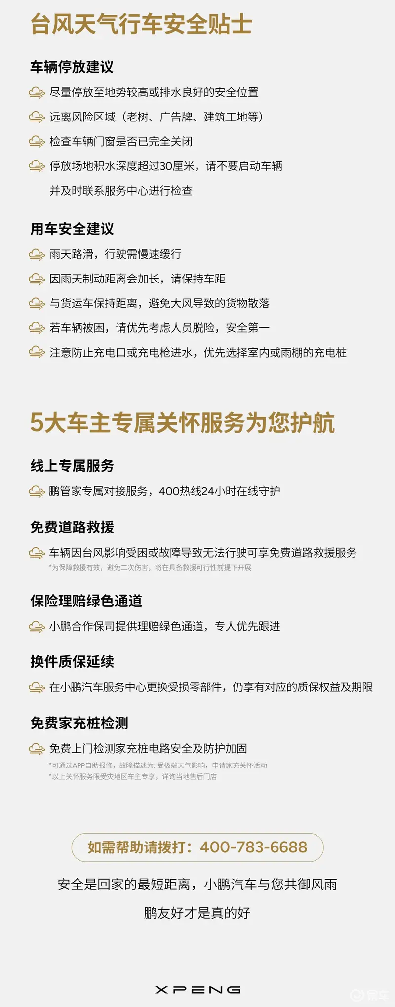 易车讯 日前,小鹏汽车官方发布,台风“桦加沙”逼近,华南、江南等地台风雨强劲,对受台风和强降雨影响的用户,推出5大车主专属关怀服务以及台风天气行车安全贴士车,为用户送上台风天气行车安全关怀。