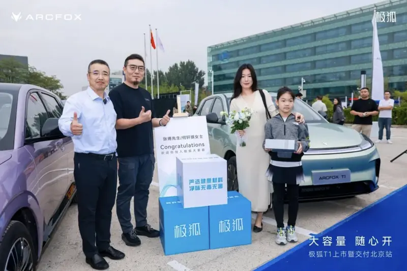 易车讯 日前,极狐T1在北京、上海成都、深圳等11座城市同步开启交付,北京地区交付仪式在北汽蓝谷隆重举行北汽新能源董事长张国富、北汽新能源总经理刘观桥等亲临现场为首批T1车主亲手送上新车钥匙与祝福。