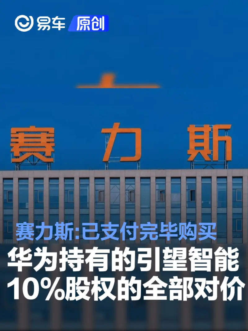 易车讯 日前,赛力斯发布公告,公司全资子公司赛力斯汽车拟以支付现金的方式购买华为技术有限公司持有的深圳引望智能技术有限公司10%股权,交易金额为人民币115亿元。