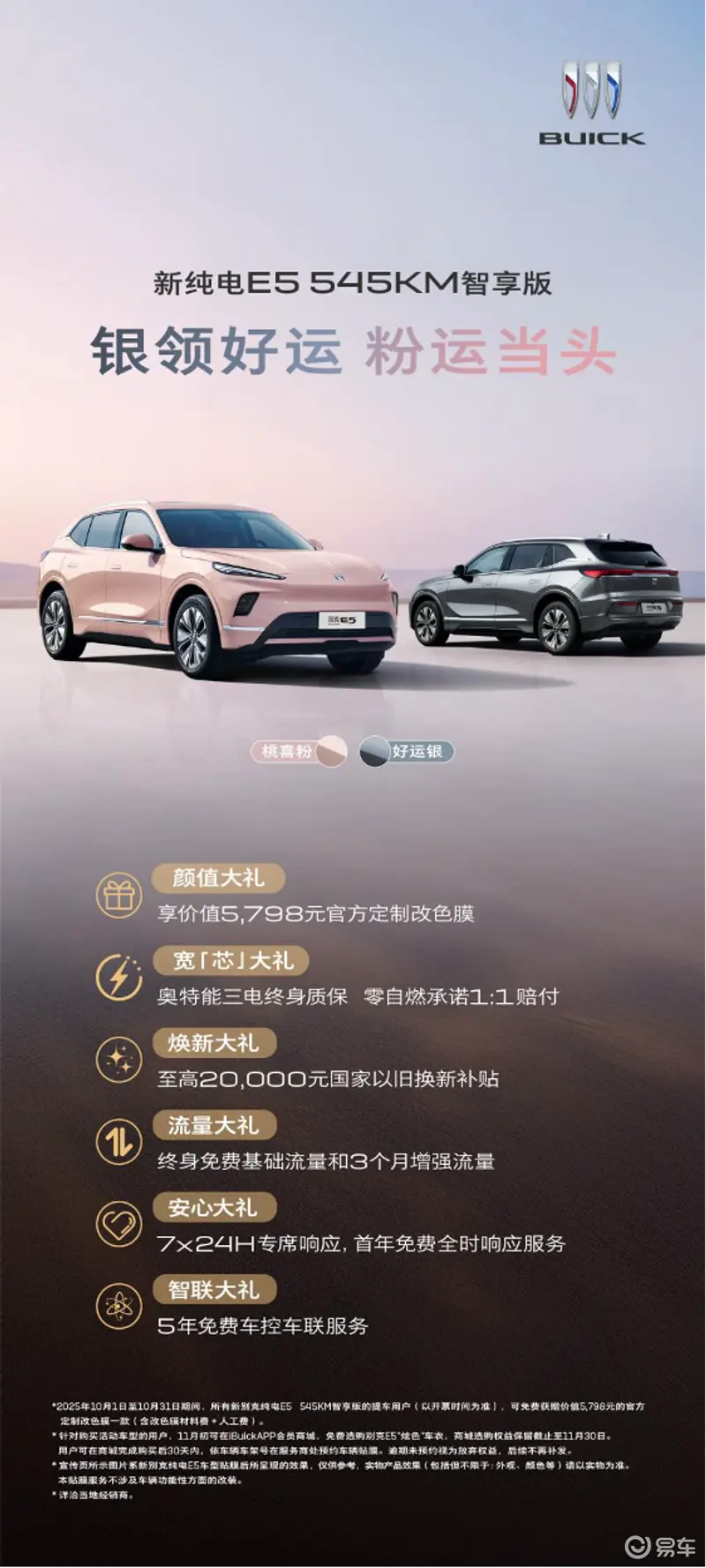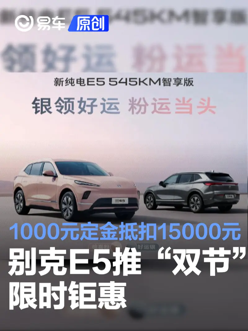 易车讯 9月30日,我们从官方渠道获悉,别克品牌推出购车重磅福利:购买别克纯电E5先享版,可在14.99万元一口价基础上,叠加至高“15 倍超级膨胀金”限时福利——1,000元定金抵扣15,000元,实际入手价低至13.59万元。同时,选购别克纯电E5智享版,可限时免费获赠售价5,798元的“好运银”或“桃喜粉”限量版炫色车衣。