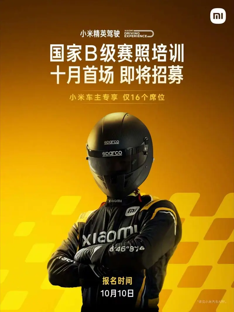 易车讯 今日,小米汽车官宣:小米精英驾驶·赛照培训十月首期,将于10月10日上午10点开启报名!小米车主专享,仅16个席位,还有小米SU7赛道体验特别课程等尊享权益。