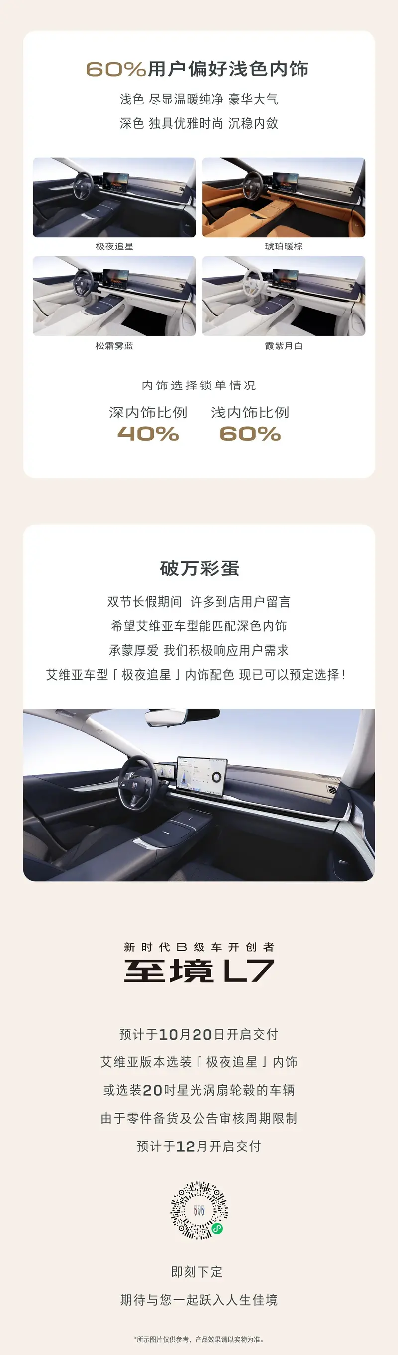 为呼应消费者的需求,境L7艾维亚版本全新推出“极夜追星”内饰色,以深邃蓝黑为基调,融汇细腻材质与雅致设计,在丰富用户选择的同时,别克始终聆听用户、敏捷回应市场需求的品牌温度。