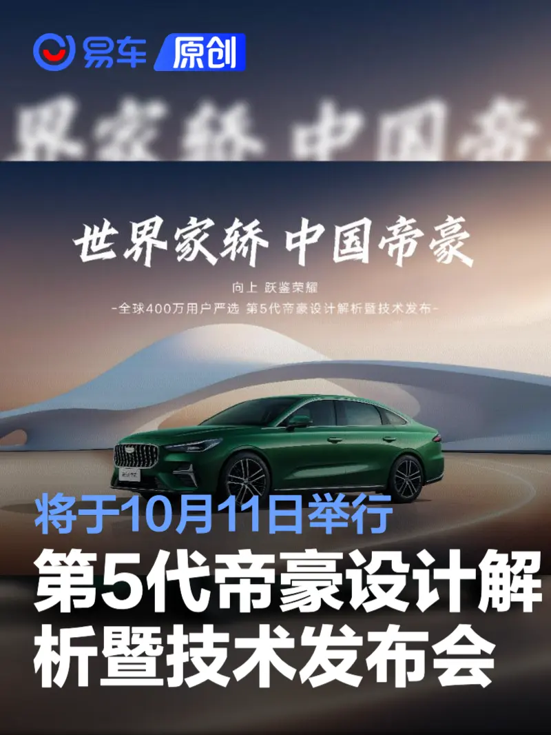 易车讯 10月11日,吉利汽车官方发布,第5代帝豪设计解析暨技术发布会10月11日将于杭州正式启幕。作为首款搭载新一代全球模块化架构的车型,第5代帝豪将围绕“五大越级实力”加速冲刺500万销量。