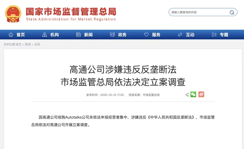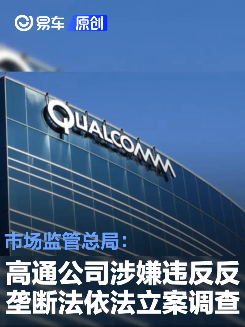 易车讯 10月10日,国家市场监管总局宣布,因高通公司收购Autotalks公司未依法申报经营者集中,涉嫌违反《中华人民共和国反垄断法》,市场监管总局依法对高通公司开展立案调查。
