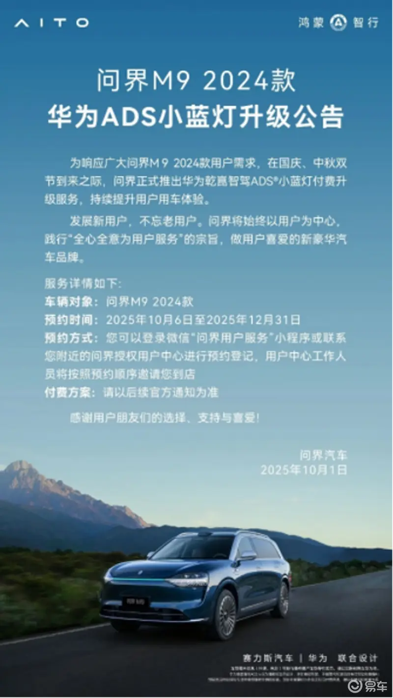 易车讯 近期,为响应广大问界M9 2024款用户的需求,问界汽车正式为问界M9 2024款用户推出华为ADS小蓝灯付费升级服务,持续提升用户用车体验。