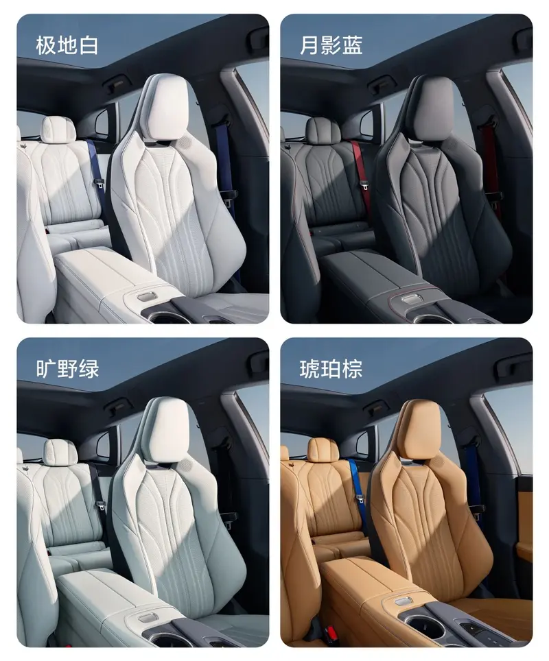 焕新极氪001将提供4种内饰颜色选择:极地白,灵感源于北极初春冰层折射阳光的纯净微光。月影蓝:灵感源于大洋深处的幽邃秘境。旷野绿:灵感源于晨光中茂密森林的深邃苍翠。琥珀棕:灵感源于琥珀的隽永棕调。