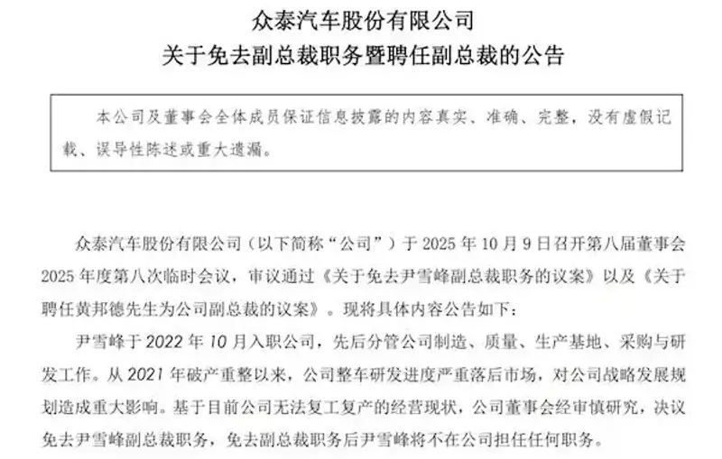 易车讯 日前,众泰汽车发布公告称,公司于2025年10月9日召开第八届董事会2025 年度第八次临时会议,审议通过《关于免去尹雪峰副总裁职务的议案》以及《关于聘任黄邦德先生为公司副总裁的议案》。