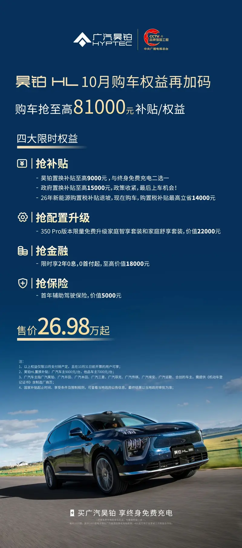 A:十月昊时光,乐享铂金礼!广汽昊铂HL十月购车权益再加码,购车即享四大限时权益,抢至高81000元重磅补贴,26.98万起,重塑出行新体验。