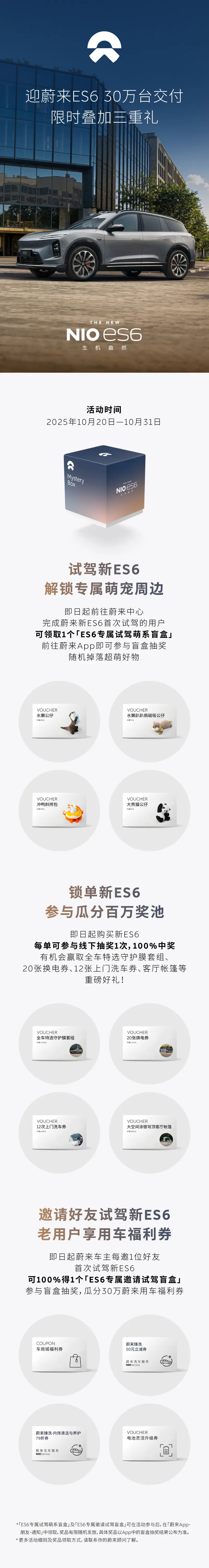 2025年10月20日-10月31日期间,前往蔚来中心完成蔚来新ES6首次试驾的用户,可领取1个“ES6专属试驾萌系盲盒”;即日起购买新ES6,每单可参与线下抽奖1次,100%中奖,有机会赢取全车特选守护膜组、20张换电劵、12张上门洗车劵、客厅帐篷等;即日起蔚来车主每邀1位好友首次试驾新ES6可100%得1个“ES6专属邀请试驾盲盒”。