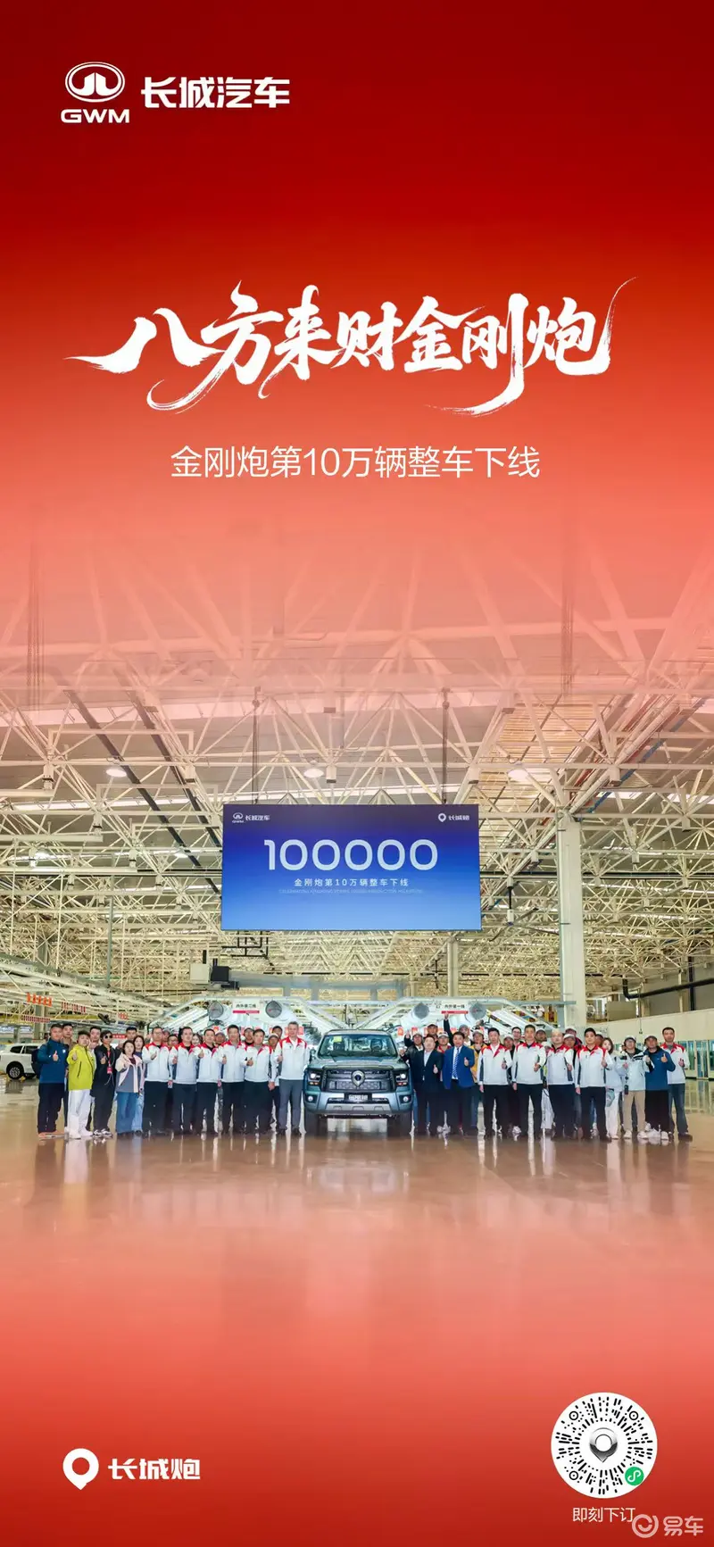 易车讯 10月22日,从长城汽车获悉,金刚炮第10万辆整车正式下线。从官方公布的信息来看,2026款金刚炮全系标配电子手刹+自动驻车,最小转弯半径仅为5.95米。动力方面,新车搭载2.0T+8AT动力总成。
