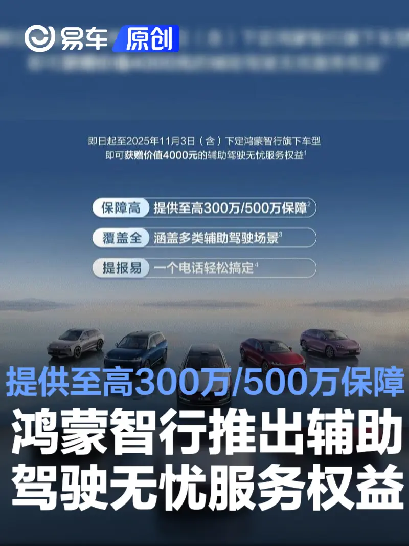 鸿蒙智行推出辅助驾驶无忧服务权益 提供至高300万/500万保障 2025-10-22 18:33 来源:汽车产经网 作者:易车原创报道 举报 易车讯 10月22日,鸿蒙智行官方宣布推出辅助驾驶无忧服务权益,提供至高300万/500万保障,涵盖多类辅助驾驶场景。 具体来看,即日起至2025年11月3日(含)下定鸿蒙智行旗下车型即可获赠价值4000元的辅助驾驶无忧权益。