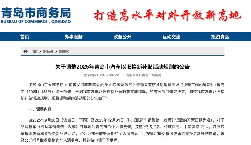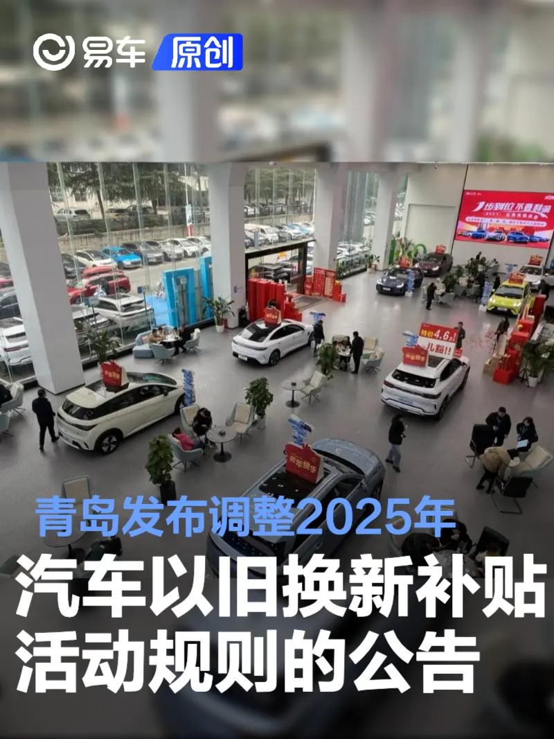 易车讯 日前,青岛市商务局发布“关于调整 2025 年青岛市汽车以旧换新补贴活动规则的公告”。自2025年9月28日(含当日,下同)至2025年12月31日(以《机动车销售统一发票》记载的开票日期为准),对于所购新车《机动车