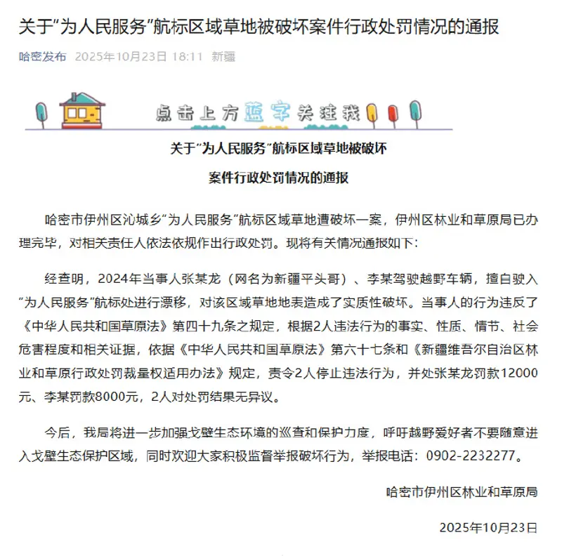 易车讯 10月23日,据哈密发布微信公众号消息,哈密市伊州区沁城乡“为人民服务”航标区域草地遭破坏一案,伊州区林业和草原局已办理完毕,对相关责任人依法依规作出行政处罚。现将有关情况通报如下: