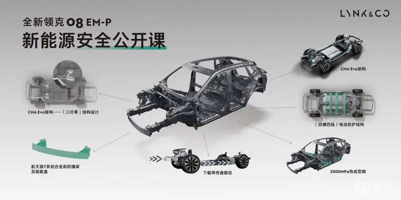 作为基于CMA Evo架构打造的家庭豪华智混SUV,全新领克08 EM-P的白车身是其被动安全实力的核心载体。其采用最高2000MPa热成型钢,一体式热成型硼钢门环将A、B柱与门槛紧密连成闭环结构,四门防撞梁以双峰断面设计进一步强化侧面承载能力;配合四横四纵专利底盘框架,在碰撞发生时可有效分散冲击力、牢牢守住座舱生存空间,更能为电池包构建全方位坚固防护。凭借这套硬核被动安全体系,领克08 EM-P在此前60米坠崖、120km/h撞击安全岛、81km/h钻卡车等多起真实极端事故中均守护用户安全,保持零伤亡记录。并且在2025年Euro NCAP测评中,还以插混车型第一名的成绩斩获五星认证,用国际权威标准彰显其被动安全的全球领先性。
