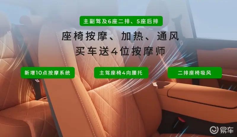 2026款零跑C16主副驾及6座二排、5座后排座椅新增主驾座椅4向腰托、10点按摩系统、二排座椅吸风功能。