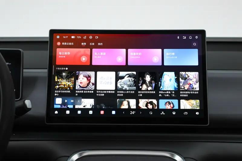 后排吸顶屏可与中控屏互动联播,支持爱奇艺、芒果 TV、全民 K 歌、网易云音乐、酷狗等音视频 APP,可通过语音/触控/手机遥控器多模式操作,也可投屏至前排中控屏操作。智能化配置方面,零跑C16搭载Leapmotor OS智能车机系统,内置有高通骁龙8295芯片,支持双区域语音唤醒识别、可见即可说、5G网络、OTA升级、车载KTV以及手机APP远程控制等。