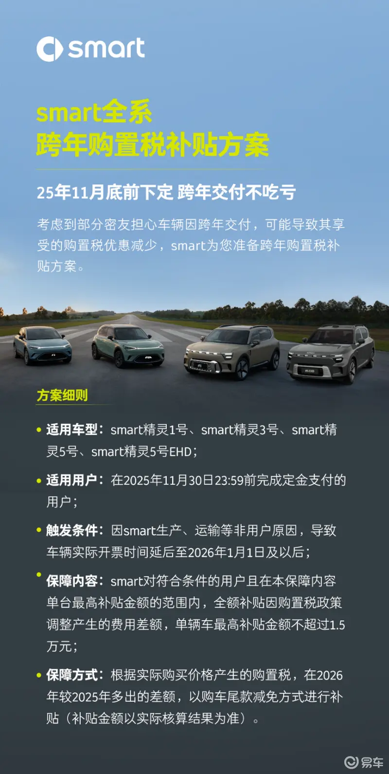 方案细则:即日起,选购smart#1、#3、#5、#5 EHD超级电混车型,并在2025年11月30日(含)前完成定金支付的用户,如因非用户原因导致车辆实际开票时间延后至2026年1月1日及以后的,smart将在最高额补贴范围内全额补贴因购置税政策调整产生的费用差额,单辆车最高补贴金额不超过1.5万元。