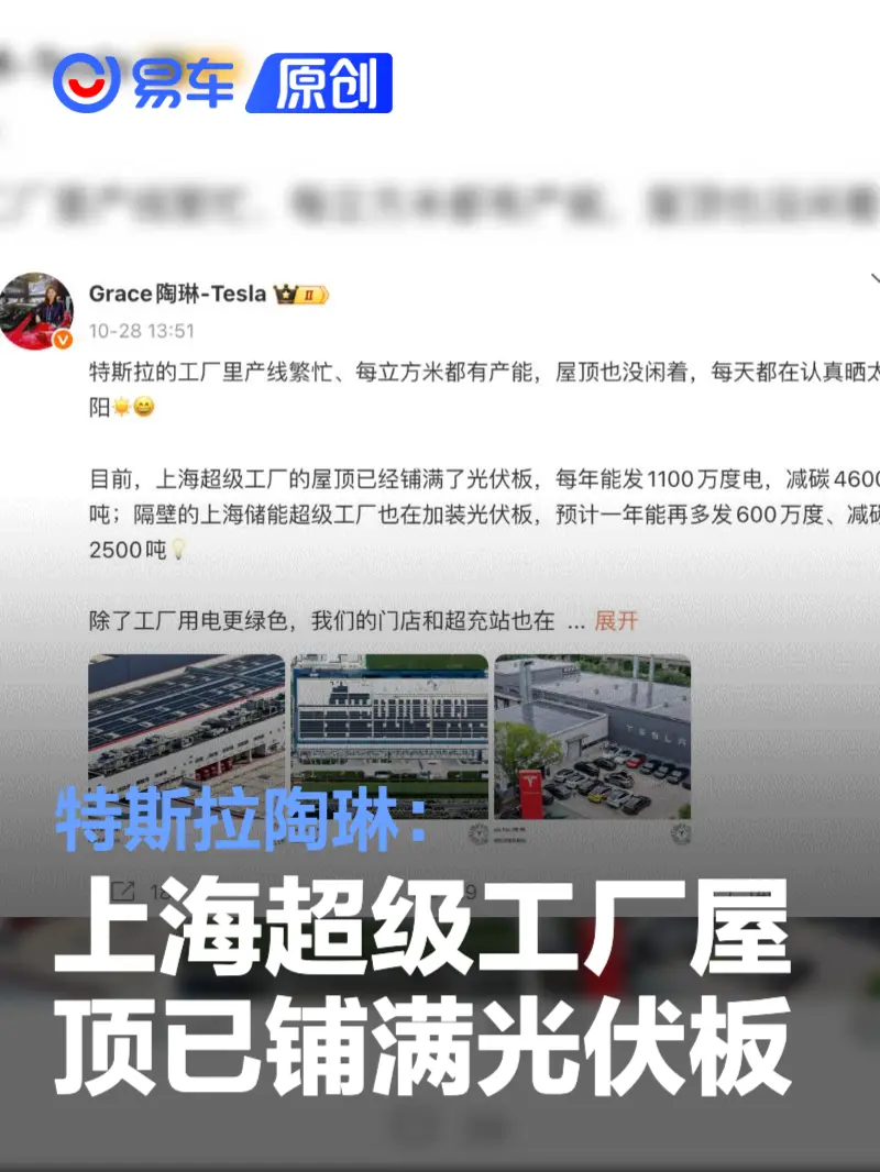 易车讯 近日,特斯拉公司副总裁陶琳在社交媒体发布,特斯拉上海超级工厂的屋顶已经铺满了光伏板,每年能发1100万度电,减碳4600吨;隔壁的上海储能超级工厂也在加装光伏板,预计一年能再多发600万度、减碳2500吨。