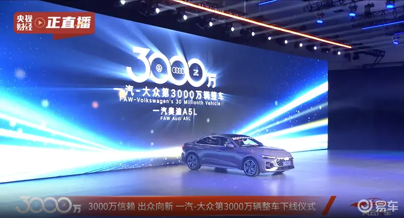 易车讯 10月30日,一汽-大众第3000万辆整车在长春基地正式下线,下线车型为一汽奥迪A5L领航版。一汽-大众成为国内首家产销突破3000万辆的乘用车企业。一汽奥迪A5L领航版此前已经开启预售,预售价28.98万元。