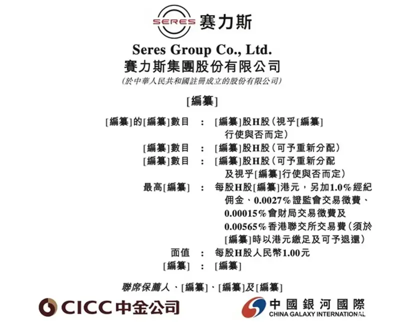 据了解,赛力斯于2025年4月28日在港交所递交招股书,由中金公司、中国银河国际联席保荐。9月23日收到中国证监会境外发行上市备案通知书,可发行不超过3.31477235亿股境外上市普通股并在香港联合交易所上市。
