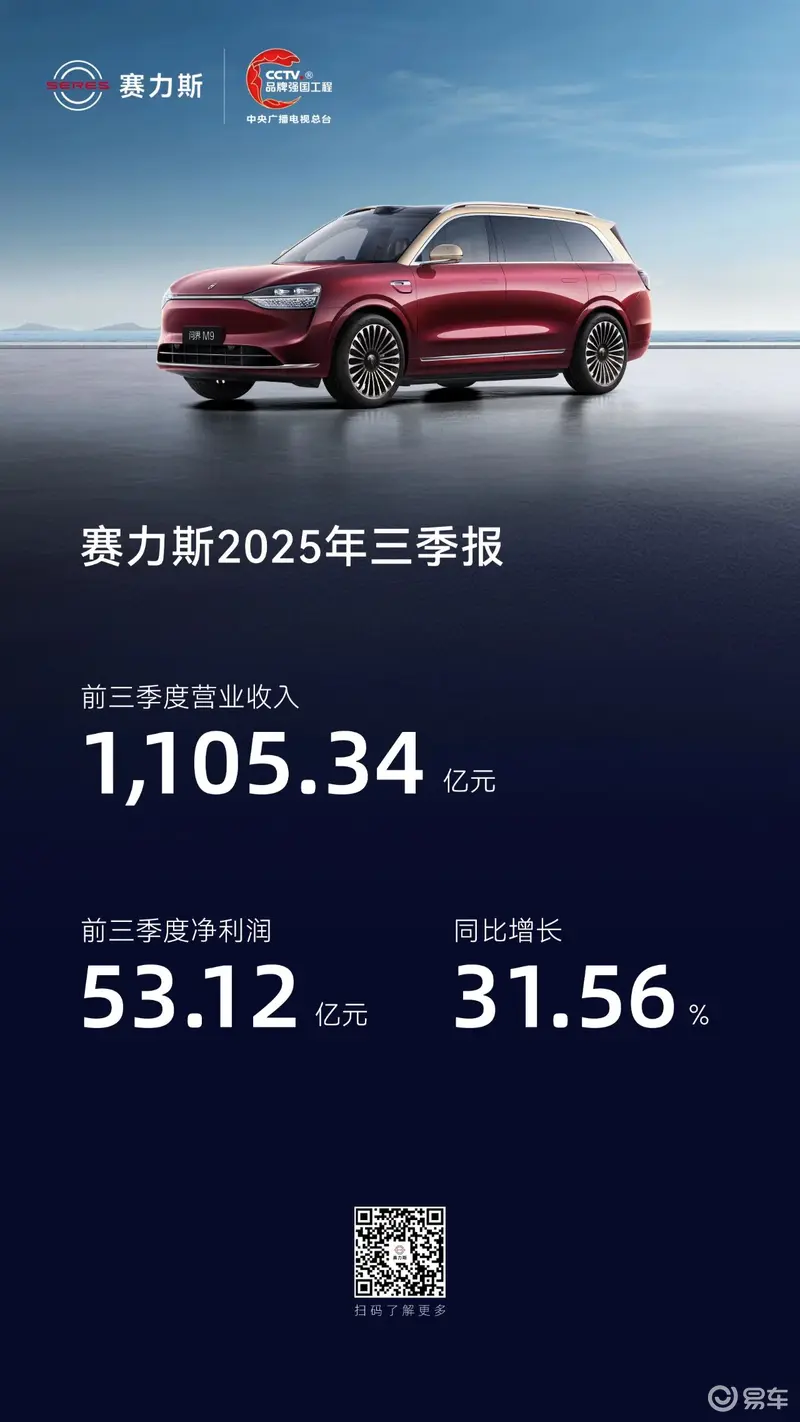 易车讯 10月30,赛力斯发布2025年三季报。报告显示,赛力斯前三季度实现营业收入1,105.34亿元,归属于上市公司股东的净利润53.12亿元,同比增长31.56%。