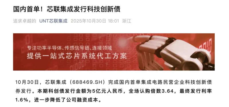 易车讯 10月30日,芯联集成(688469.SH)完成国内首单集成电路民营企业科技创新债券发行。本期科创债发行金额为5亿元人民币,全场认购倍数3.64,最终发行利率1.6%,进一步降低了公司融资成本。