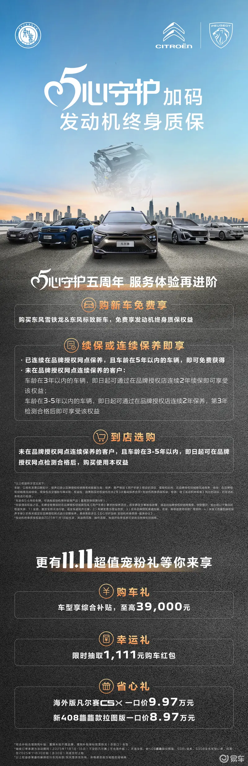 易车讯 11月1日,神龙汽车推出发动机终身质保政策,符合相关条件的用户在获得该权益后,若车辆在正常使用及规范维保的情况下,发动机总成系统发生质量问题,可前往全国任意一家品牌授权网点享受免费的修复服务。
