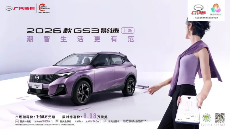 更为重要的是,在配置加码升级的同时,新车价格向下渗透。2026款传祺GS3影速官方指导价为7.98万元-9.98万元,限时惊喜价6.98万元起,并可享0首付、8万3年0息。以“增配价更低”的诚意,真正做到了让用户“不做选择题”,鱼与熊掌可以兼得。它将凭借全面的产品实力,成为用户生活旅途的“全能搭子”,陪伴用户将探索的足迹从熟悉街巷延伸至诗意远方,在每一次出发与抵达之间,开拓更广阔的人生版图。