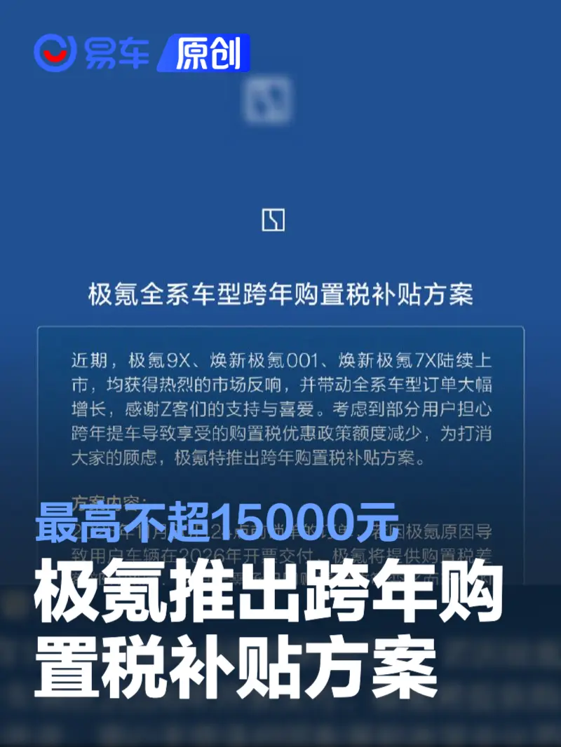 易车讯 近日,极氪汽车官方宣布,考虑到部分用户担心跨年提车导致享受的购置税优惠政策额度减少,为打消大家的顾虑,极氪特推出跨年购置税补贴方案。