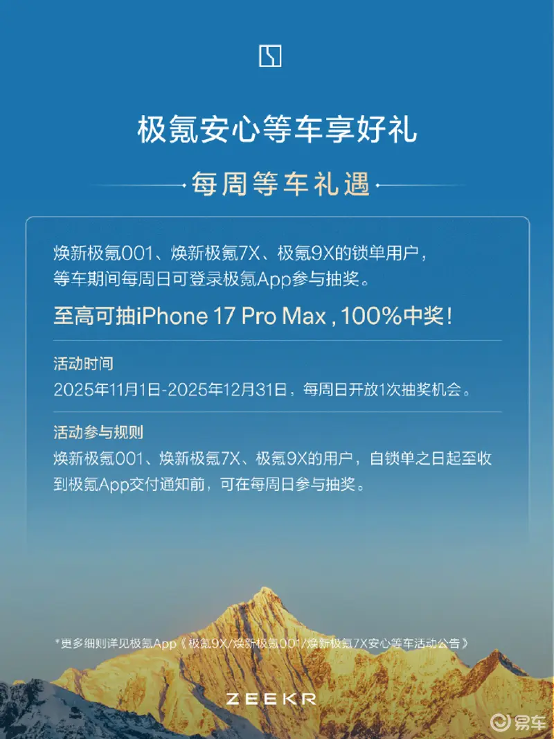同时,推出极氪安心等车享好礼,含安心等车极分和每周等车礼遇两部分。安心等车极分,若焕新极氪001等车超6周,超出后每日享受1000极分,若焕新极氪7X等车超4周,超出后每日享受1000极分若极氪9X等车超10周,超出后每日享受1000极分。每周等车礼遇,焕新极氪001、焕新极氪7X、极気9X的锁单用户等车期间每周日可登录极氪App参与抽奖。