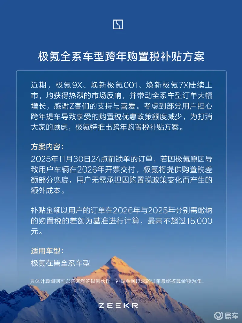 2025年11月30日24点前锁单的订单,若因极氪原因导致用户车辆在2026年开票交付,极氪将提供购置税差额部分兜底,用户无需承担因购置税政策变化而产生的额外成本。补贴金额以用户的订单在2026年与2025年分别需缴纳的购置税的差额为基准进行计算,最高不超过15000元。适用车型:极氪在售全系车型。