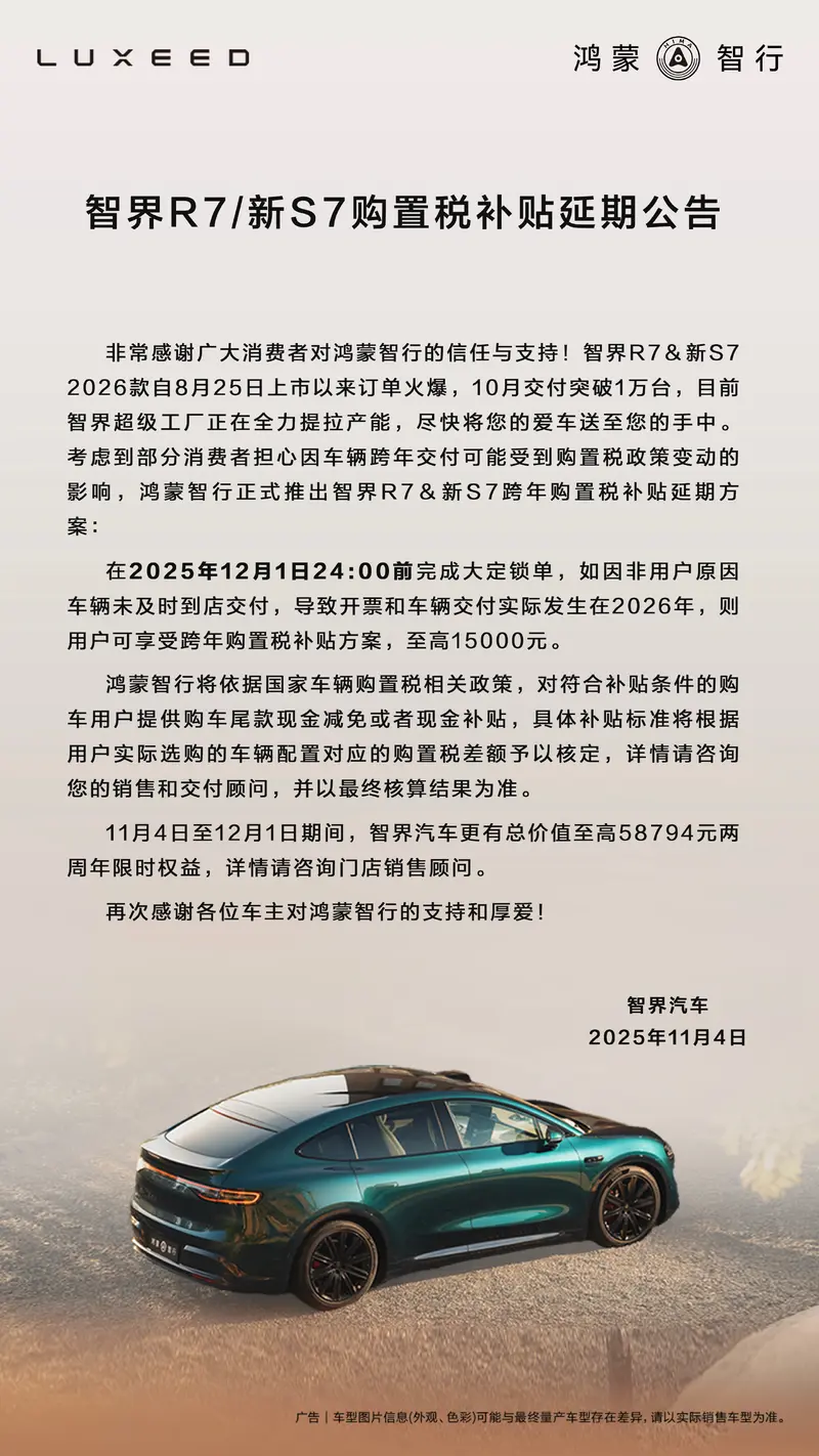 易车讯 11月4日,智界汽车官方发布R7和新S7购置税补贴延期公告。在2025年12月1日24点前完成大定锁单并确认交付方案,如因非用户原因车辆未及时到店交付,导致开票和车辆交付实际发生在2026年,则用户可享受至高15000元跨年购置税补贴。