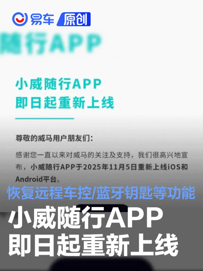 小威随行APP即日起重新上线 恢复远程车控/蓝牙钥匙等功能 2025-11-05 09:55 来源:汽车产经网 作者:易车原创报道 举报 易车讯 日前,威马汽车官方宣布,小威随行APP于2025年11月5日重新上线iOS和Android平台,已恢复蓝牙车控、远程车控、蓝牙钥匙、车辆信息同步功能。 此外,威马汽车还恢复了过往注册账号及车辆信息,小威随行APP试运行阶段支持威马EX5(可旋转小屏版)和威马EX6。威马汽车表示,更多威马车型适配工作,将依法依规持续推进。我们深知威马重组工作道阻且难,用户的期待是我们前进的动力,请给予我们更多的时间和信心。