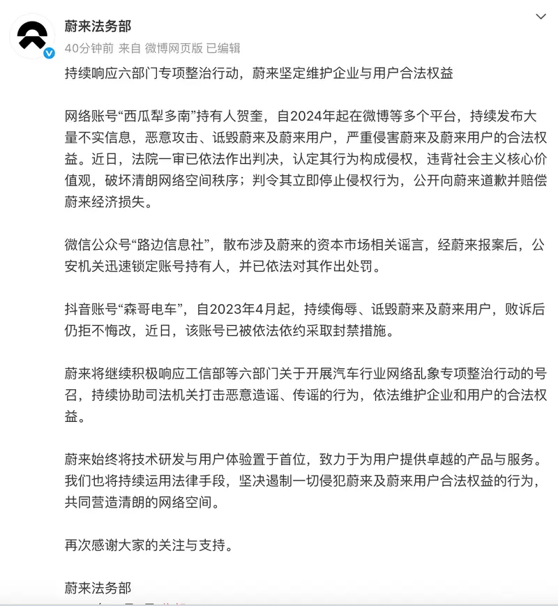 蔚来将继续积极响应工信部等六部门关于开展汽车行业网络乱象专项整治行动的号召,持续协助司法机关打击恶意造谣、传谣的行为,依法维护企业和用户的合法权益。