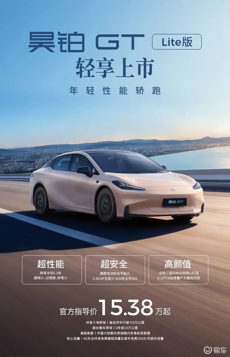 广汽昊铂GT全新LITE版轻享上市,官方指导价15.38万元起。自上市日起,订购昊铂GT Lite版的用户可享受“四大上市权益”,包括终身三电质保、超长整车质保、免费道路救援及安心流量,全方位保障用户用车无忧。