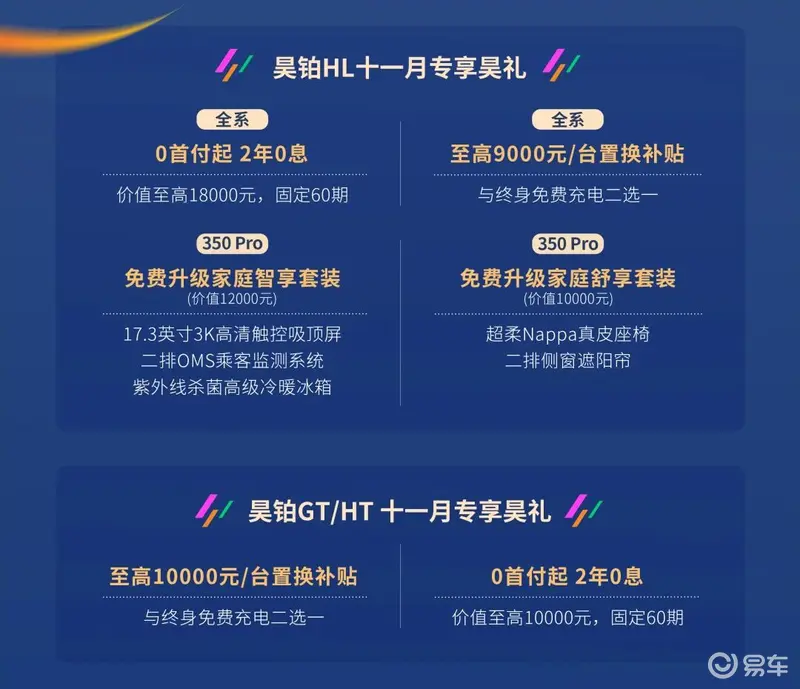 双十一期间下单,享定金膨胀礼遇。11月1日至11日期间下定昊铂HL/HT/GT车型,且在11月30日前完成开票的昊铂车主可享尾款减免。其中,下定昊铂HT/GT可享2000元定金抵扣5000元尾款,下定昊铂HL可享5000元定金抵扣8000元尾款。此外,广汽昊铂还针对十一月推出了专享昊礼,购买昊铂HT/GT可享终身免费充电或至高10000元/台置换补贴二选一;购买昊铂HL可享终身免费充电或至高9000元/台置换补贴二选一,350 Pro版还可免费升级家庭智享套装、家庭舒享套装,让您购车无忧,用车安心!(具体权益,请垂询当地经销商)