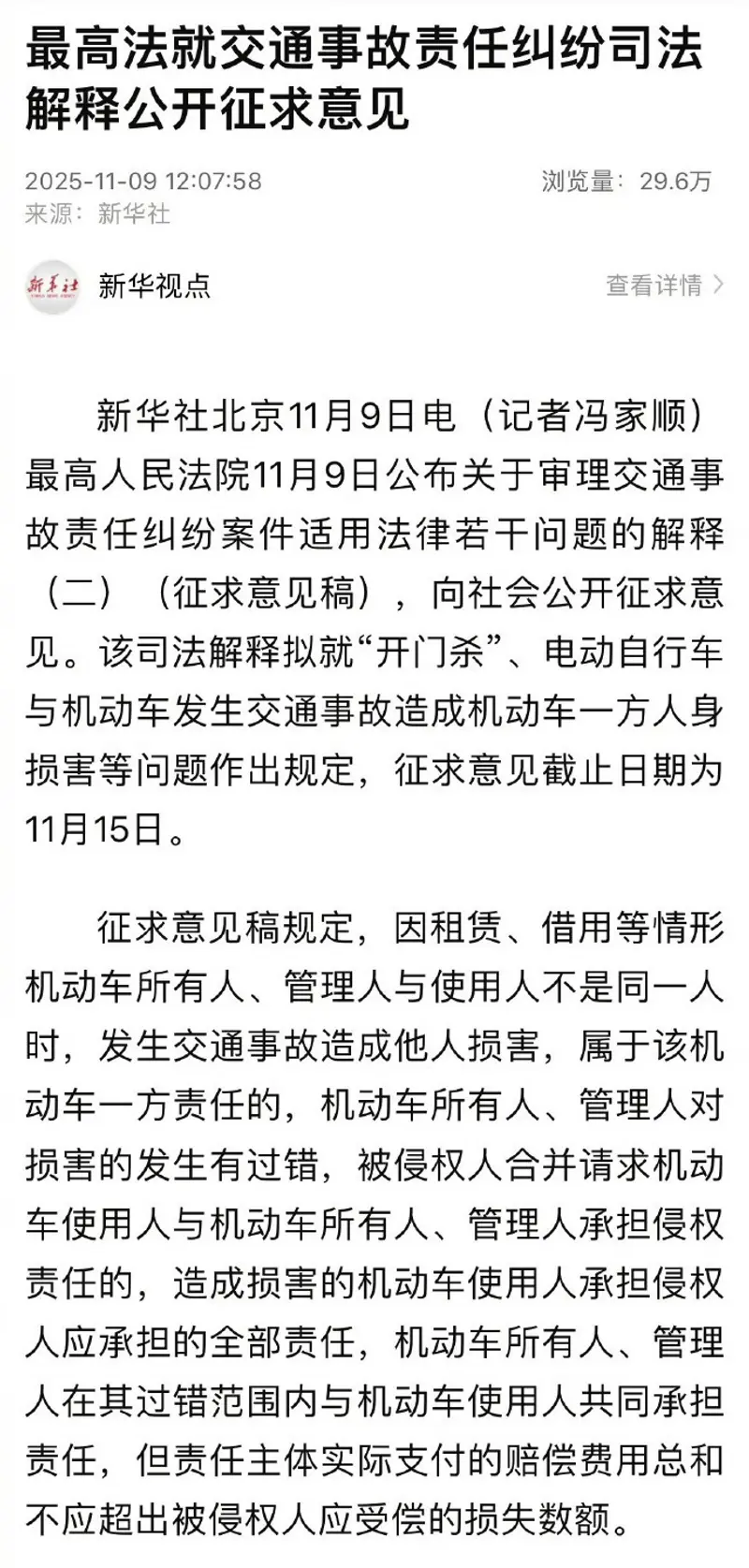 易车讯 11月9日,《关于审理交通事故责任纠纷案件适用法律若干问题的解释(二)(征求意见稿)》公开征求意见,该司法解释拟就“开门杀”、电动自行车与机动车发生交通事故造成机动车一方人身损害等问题作出规定,征求意见截止日期为11月15日。