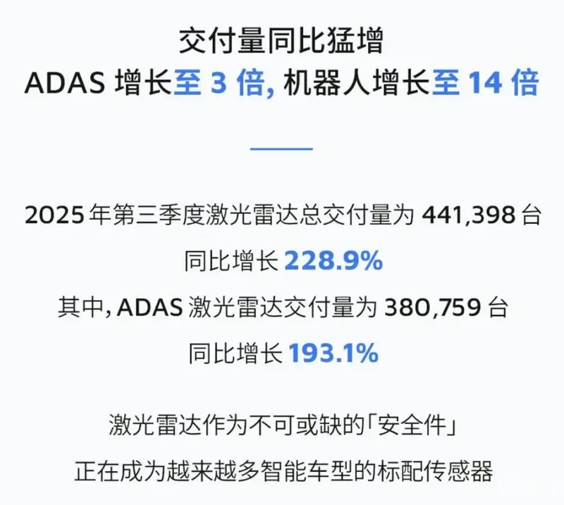 第三季度,禾赛斩获前两大 ADAS 客户 2026 年全系车型定点合作,并实现 100% 标配。同时,禾赛 ETX+FTX 产品组合斩获首个乘用车量产定点,以“主雷达+多颗补盲雷达”的配置实现全域感知覆盖,计划于 2026 年底或 2027 年初启动量产。